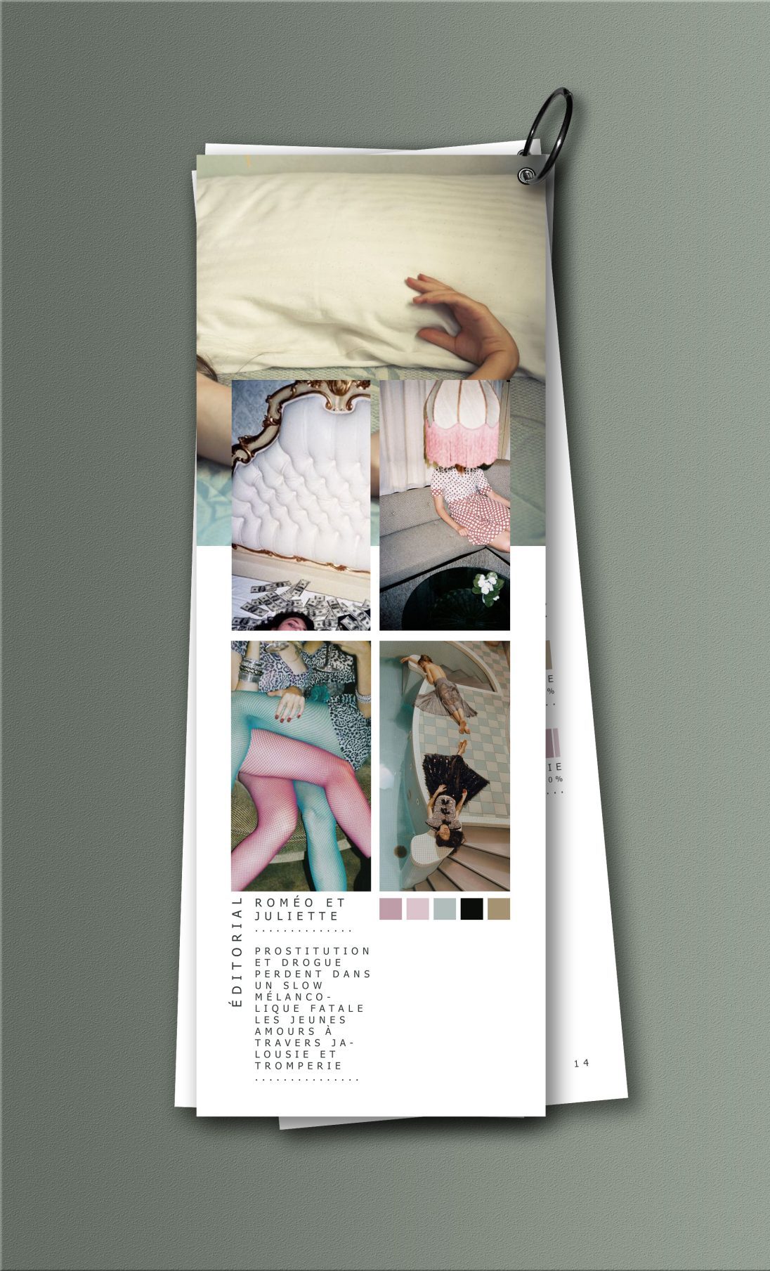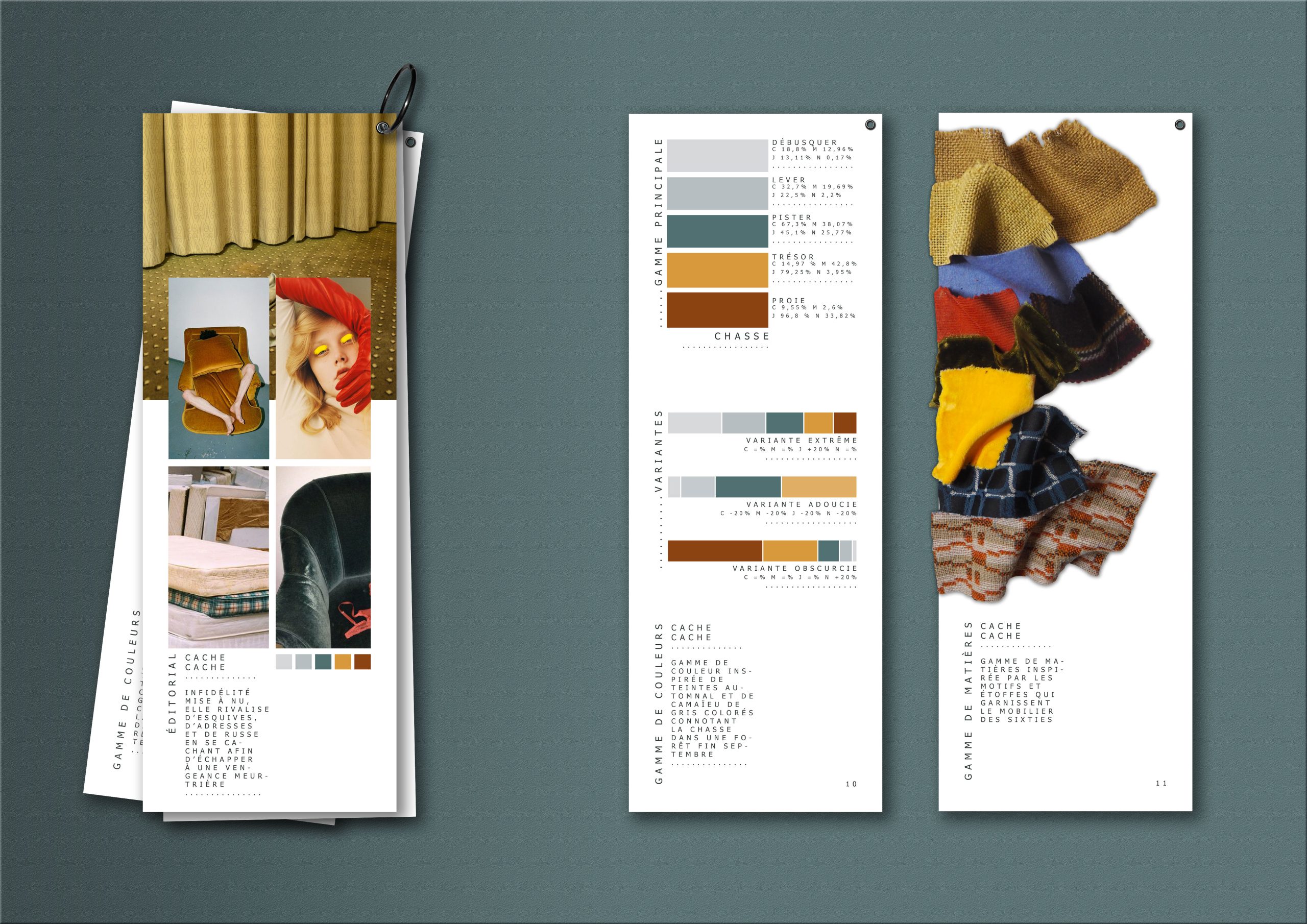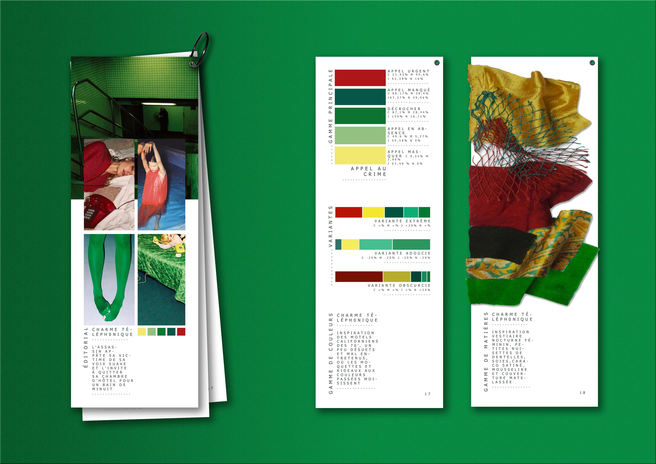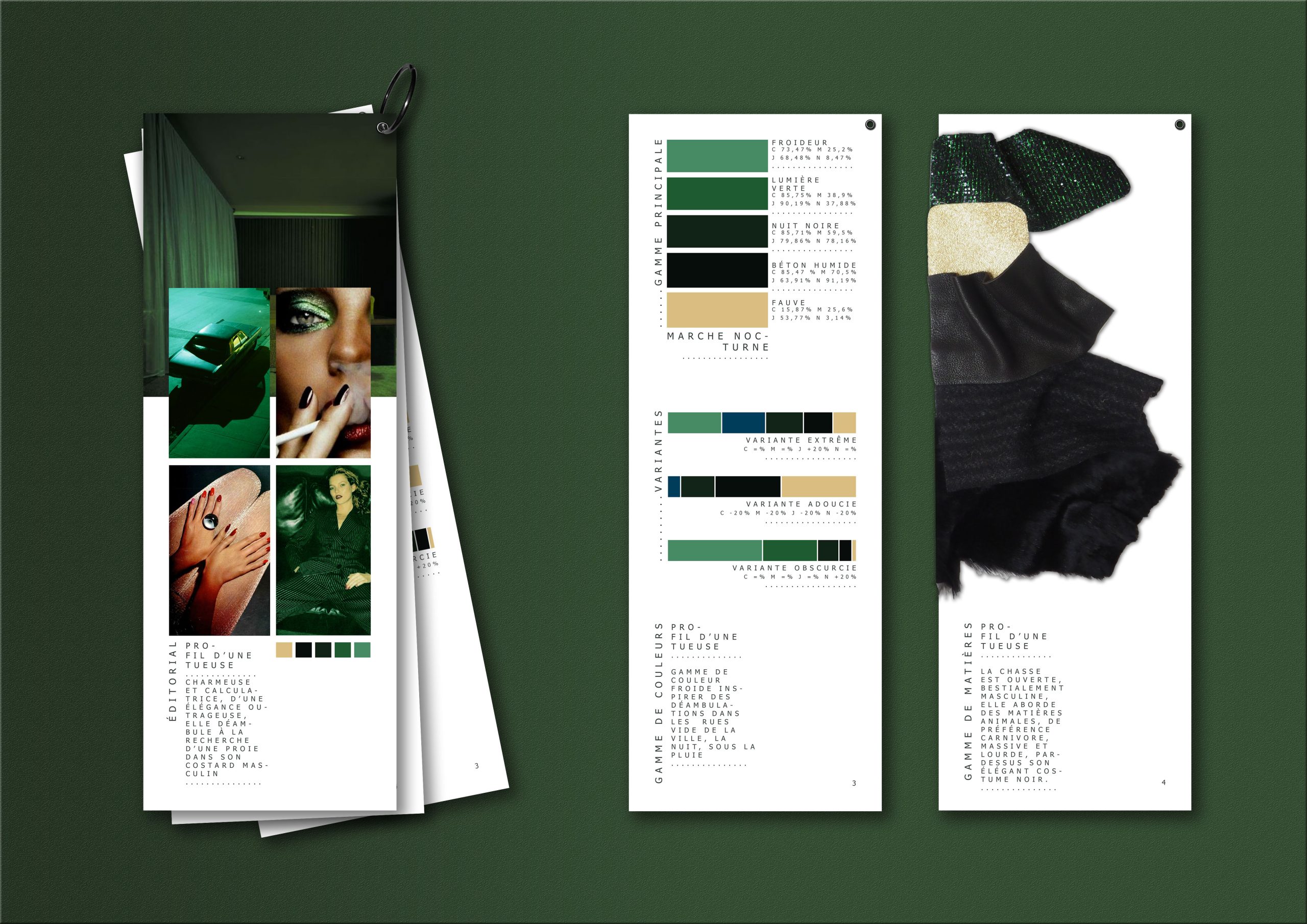 CE CAHIER DE TENDANCES S'ARTICULE AUTOUR DE SAYNÈTE À LA AGATHA CHRISTIE, OÙ SE JOUE UN JEU DE SÉDUCTION ENTRE VICTIME ET ASSASSIN. LES RECHERCHES ICONOGRAPHIQUES SCÉNARISENT LA COMÉDIE TRAGIQUE QUI SE DÉROULE, INDUISANT TOUTE UNE MISE EN SCÈNE COLORIMÉTRIQUE ET TEXTURALE. "CHARMEUSE ET CALCULATRICE, D'UNE ÉLÉGANCE OUTRAGANTE, ELLE DÉAMBULE À LA NUIT À LA RECHERCHE D'UNE PROIE DANS SON COSTARD MASCULIN." L' EXÉGÈSE DE PROFIL D'UNE TUEUSE NOUS AMÈNE DANS LES COULISSES D'UNE NUIT HIVERNALE, AUX COULEURS FROIDES ET PARSEMÉES DES BRILLANCE DES LUMIÈRES DE LA VILLE, QUI FONT SCINTILLER SES YEUX D'ENVIE. LA PROTAGONISTE D'UNE SENSUALITÉ REPTILIENNE, NOUS PLAQUE CONTRE LE FROID DU CUIR ET NOUS HYPNOTISE DU REFLETS DES SEQUINS.