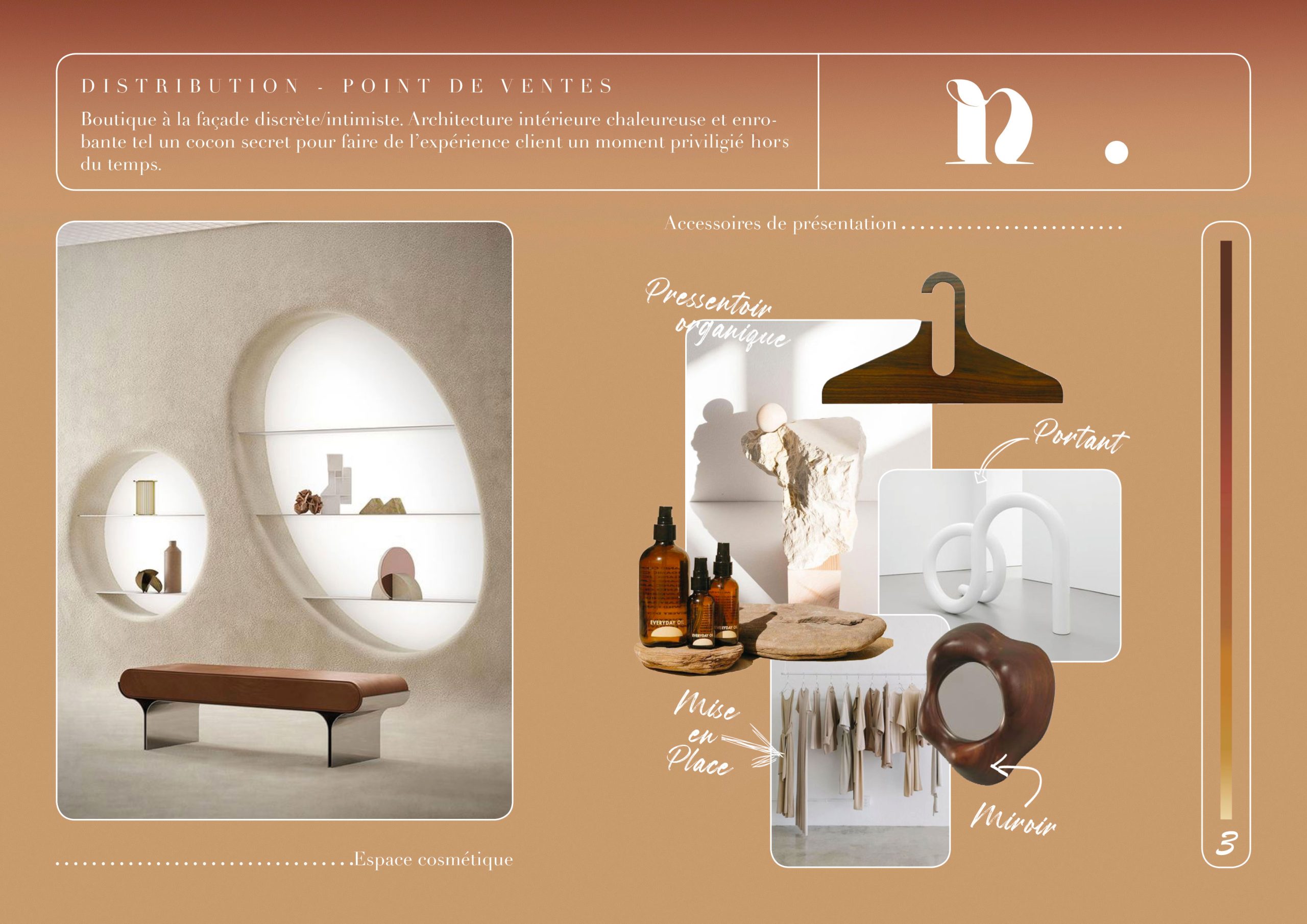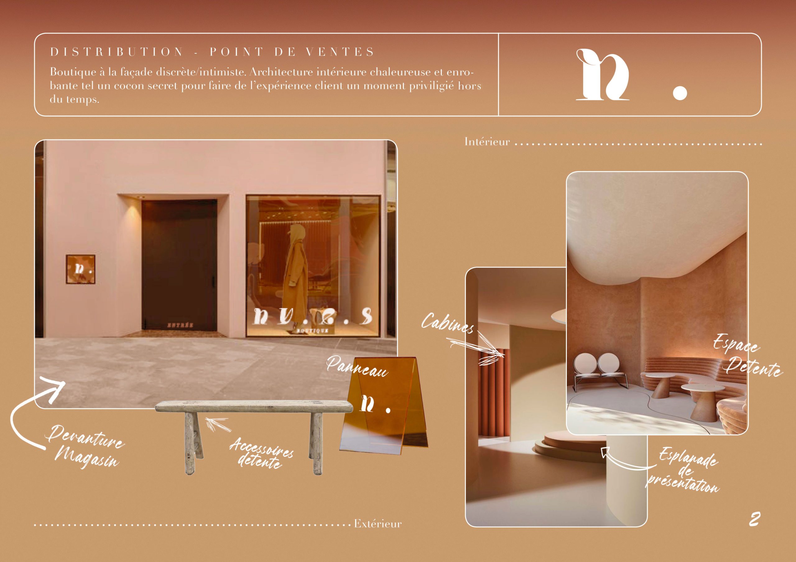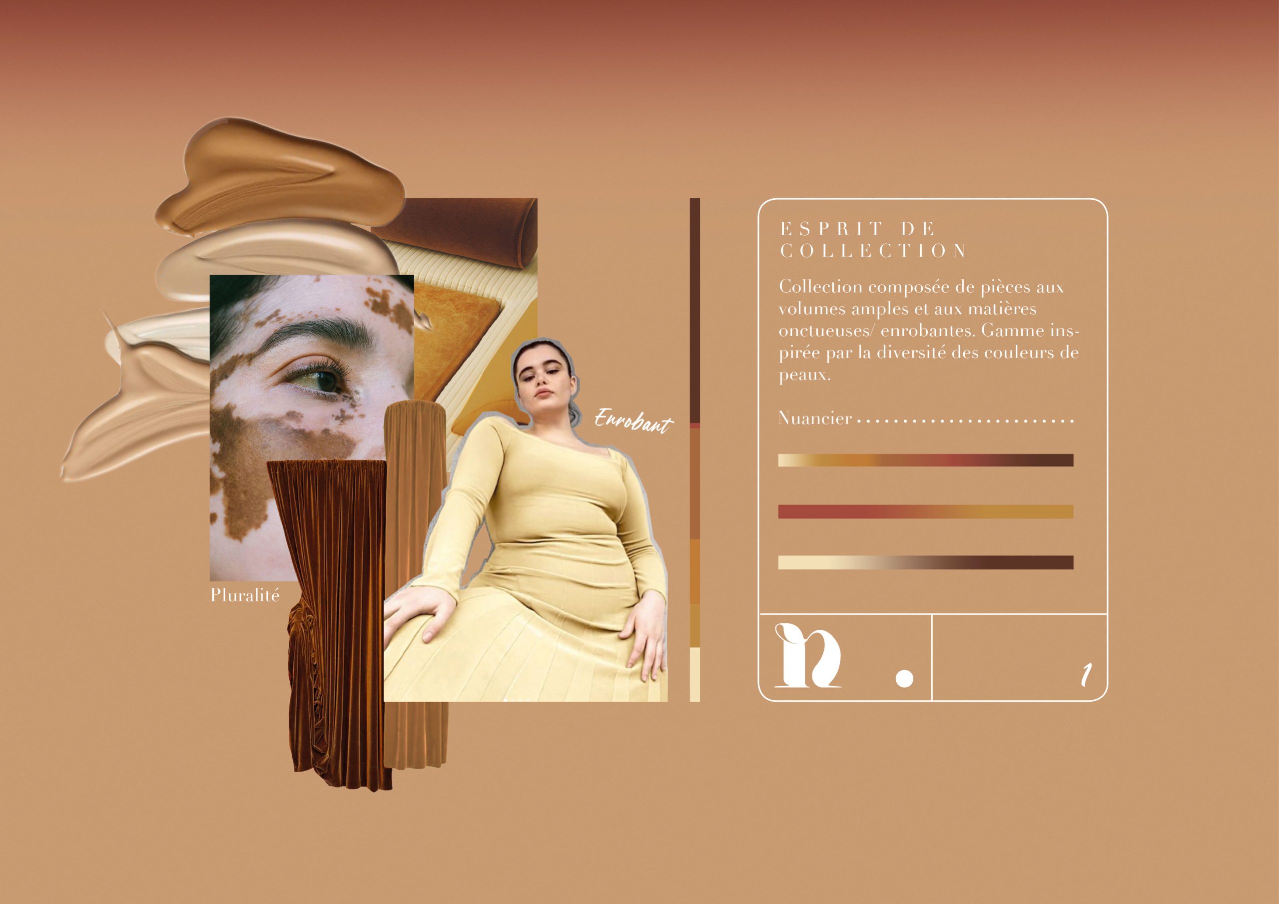 NU.E.S EST UNE MARQUE DE PRÊT À PORTER féminin. La dénomination NU.E.S revendique la pluralité des corps, PAR L'UTILISATION DU MASCULIN, FÉMININ, ET PLURIEL, TOUT EN QUESTIONNANT LE BEOIN ORIGINEL DE L'HABILLEMENT : LE NU DOIT SE VÊTIR. LA DIRECTION ARTISTIQUE S'EST FAÇONNÉE AUTOUR DE CETTE VOLONTÉ DE RETOUR À L'ESSENCE MÊME DU VÊTEMENT, EN PROPOSANT DES PIÈCES INTEMPORELLES ET QUI DURENT DANS LE TEMPS, À CONTRE-COURANT DES PRATIQUES SOCIÉTALES ACTUELLES. le logotype, par ses formes ondulant de fluettes à corpulentes, TRADUIT L'HÉTÉROGÉNÉITÉ DES CORPS. Les couleurs neutres de la gamme SONT DOUCES ET PROTECTRICES, elles se veulent ENGLOBANTES TELLE UNE SECONDE PEAU. ELLES évoqueNT les choses simples, brutES ET NATURELLES. LE MOODBOARD manifeste une esthétique aux VOLUMES AMPLES et FINITIONS ARRONDIES, DES TEXTURES ONCTUEUSES ET des TOUCHÉS ENROBANTS.